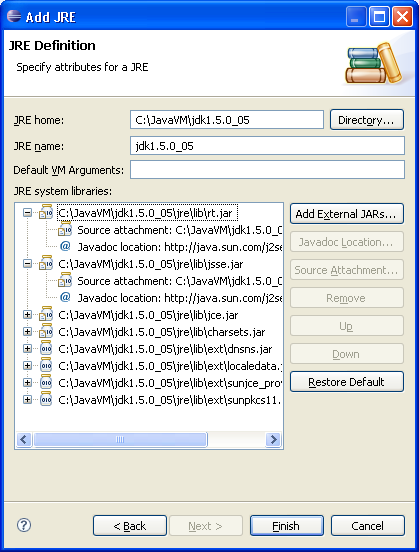 by scanning the location. You can further customize the JRE install, specifying vm arguments, source attachments, etc.