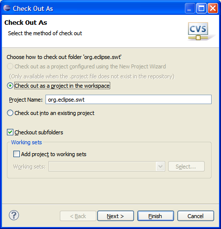 Once one or more modules are selected, you can choose to check out one or more selected modules as a new projects or into an existing project or folder. If one module is selected and it does not contain a .project file (the Workbench project configuration file), you will also have the option to configure the project using the new project wizard (in order to make the project a Java project, for instance). The option to check out subfolders is selected by default. Also, you are given the option to add the checked out modules to a working set.